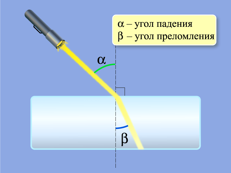 Если световой пучок падает на поверхность, разделяющую две прозрачные среды разной оптической плотности, например воздух и воду, то часть света отражается от этой поверхности, а другая часть — проникает во вторую среду. При переходе из одной среды в другую луч света изменяет направление на границе этих сред. Это явление называется преломлением света.