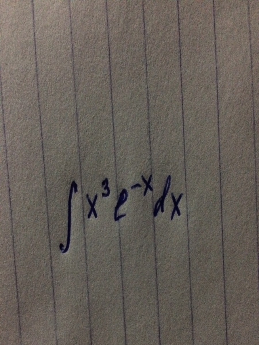 int(x^3*e^{-x})dx=[u=x^3Rightarrow du=3x^2dx; dv=e^{-x}dxRightarrow v=-e^{-x}]=\=-e^{-x}*x^3+int e^{-x}*3x^2=\=[u=3x^2Rightarrow du=6xdx; dv=e^{-x}dxRightarrow v=-e^{-x}]=\=-e^{-x}*x^3-e^{-x}*3x^2+int{e^{-x}}*6xdx=\=[u=6xRightarrow du=6dx; dv=e^{-x}dxRightarrow v=-e^{-x}]=\=-e^{-x}*x^3-e^{-x}*3x^2-e^{-x}*6x+int 6e^{-x}dx=\=-e^{-x}*x^3-e^{-x}*3x^2-e^{-x}*6x-6e^{-x}=e^{-x}(x^3+3x^2+6x+6)