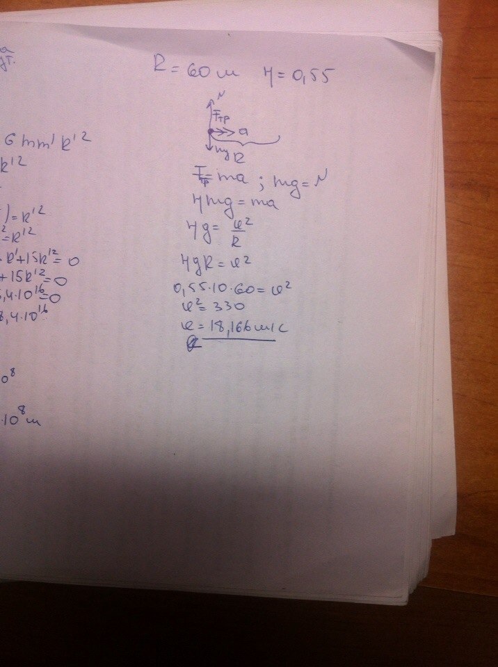 С какой наибольшей скоростью автомобиль может проходить по горизонтальной дороге поворот радиусом 60 м, если коэффициент трения между шинами и дорогой равен 0,55?