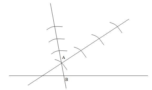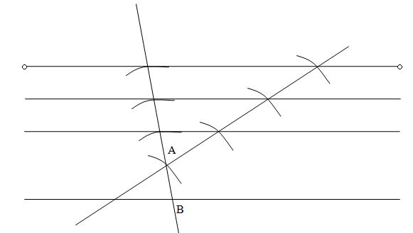 2) через первую отсечку (точка А) проведем еще одну прямую, которая пересечет данную в точке В; на этой прямой отложим три отсечки раствором циркуля равным АВ (рисунок 2)