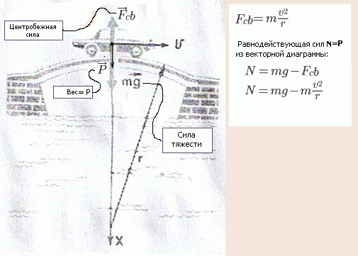 Автомобиль весом Р движется с постоянной скоростью по вогнутому мосту радиуса R.Какое давление оказывается автомобиль на мост, проезжая через середину моста?