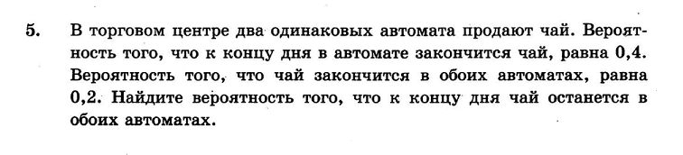 В торговом центре два одинаковых автомата продают чай.Вероятность того,что в к концу дня в автомате закончится чай,равна 0,4