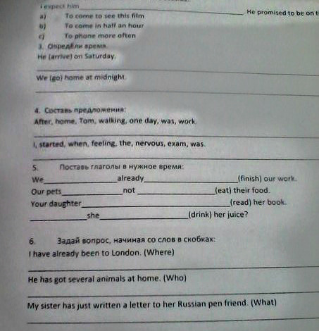 5)We are already finished our work( Мы уже закончили нашу работу). Our pets are not ate their food ( Наши питомцы не съели их еду ). Your daughter was reading her book ( Твоя дочка читала её книгу ). Did she drink her juice? ( Она выпила свой сок? )