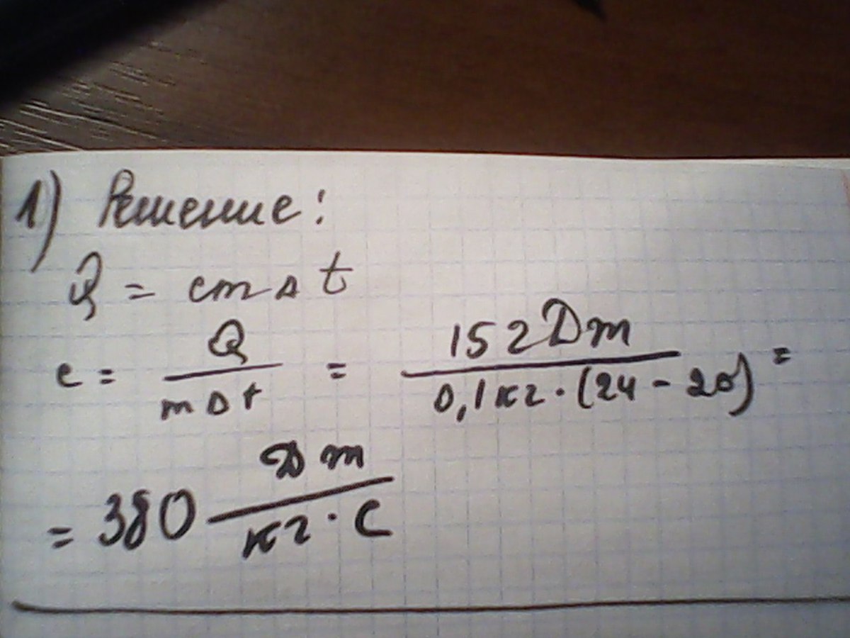1)Определите удельную теплоемкость металла,если для изменения температуры от 20 до 24°C у бруска массой 100гр,сделанного из этого металла,внутренняя энергия увеличивается на 152 Дж.