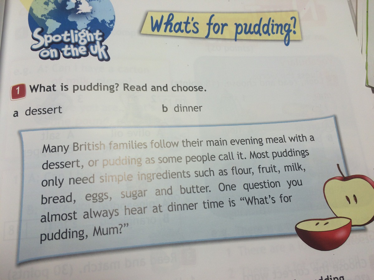 1.а.Многие британские семьи следуют главному вечернему принятию пищи-десерту(Многие британские семьи употребляют ужином десерт) или пудинг как некоторые люди называют его.Для пудинга нужнs только самые простые ингридиенты ,такие как мука, фрукты, молоко,хлеб, яйца,сахар и масло.Вопрос, которые ты почти всегда слышишь в обеденное время-"Что на пудинг,мама?"