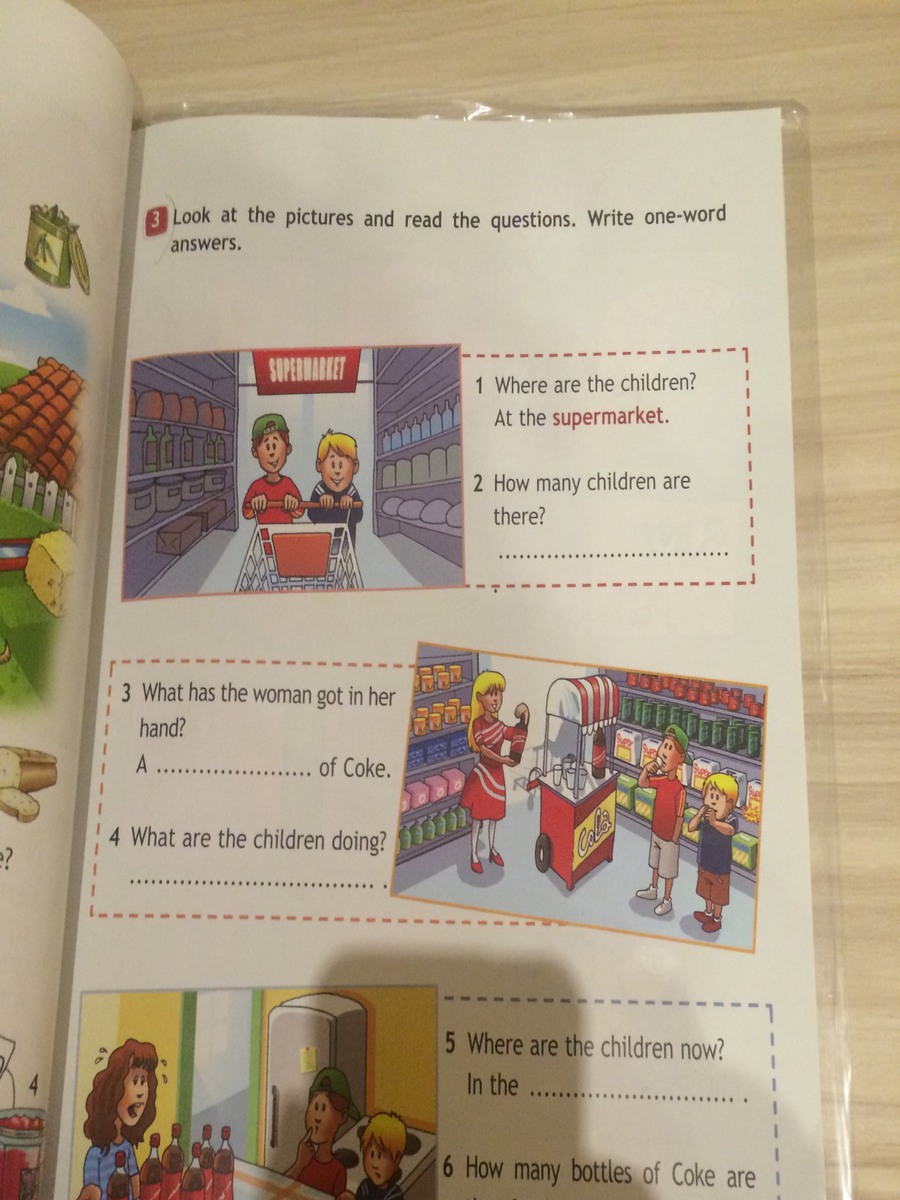 1.At the supermarket.2.Two.3.A bottle of "Coca-Cola".4.Drinking.5.house.6....