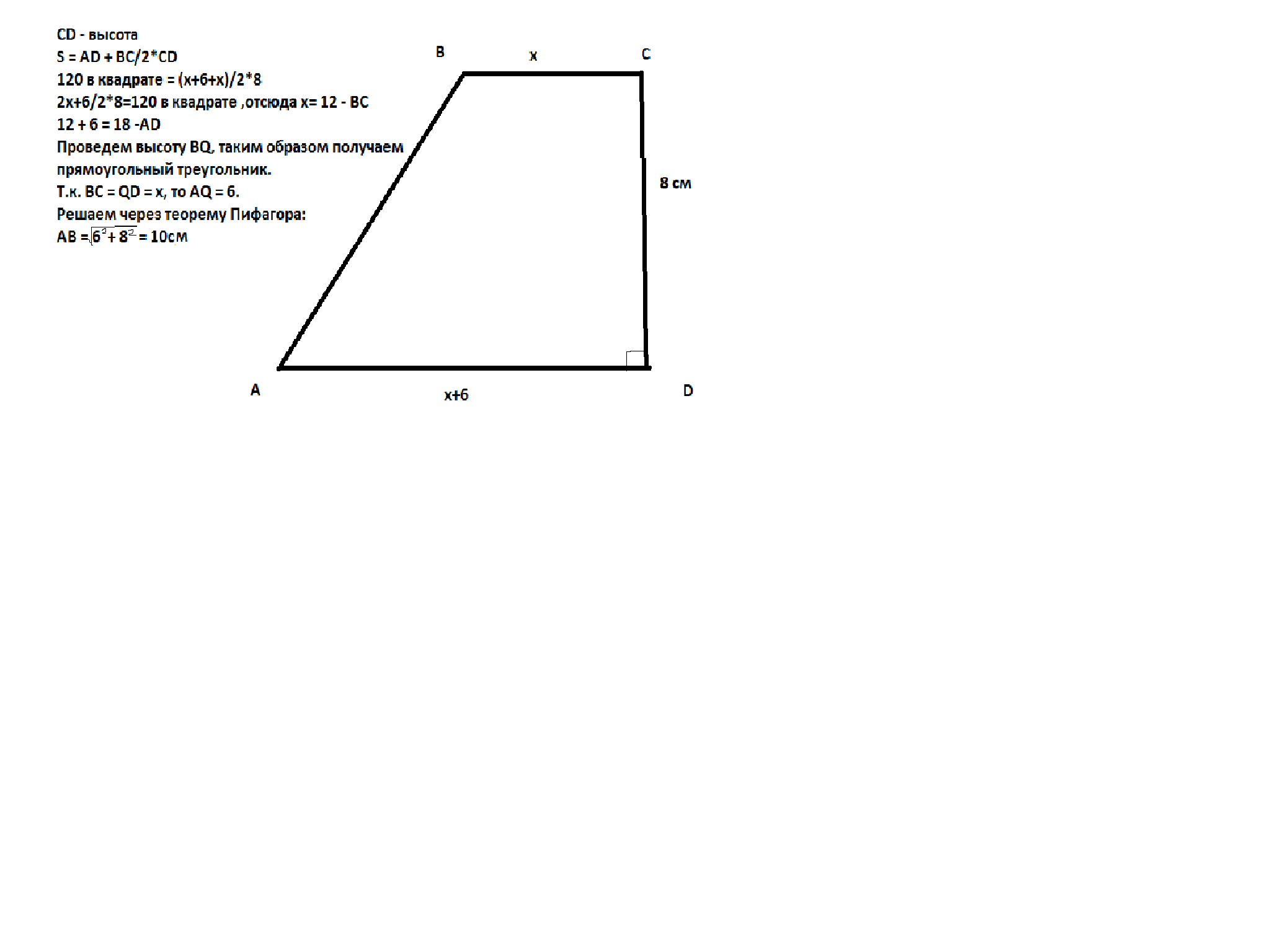 Площадь прямоугольной трапеции равна 120 см в квадрате,а ее высота равна 8 см.Найдите все стороны трапеции,если одно из оснований больше другого на 6 см.