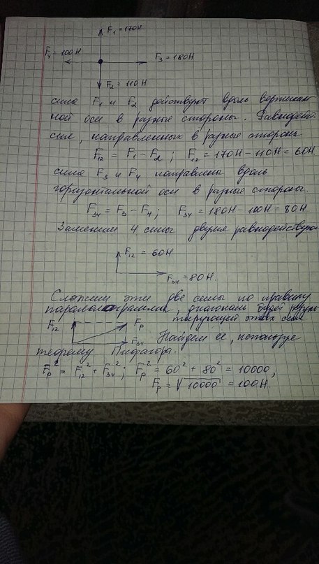 на одну точку тела действуют следующие силы:170 Н вертикально вверх,110 Н вертикально вниз,180 Н горизонтально вправо и 100 Н горизонтально влево. определите равнодействующую этих сил