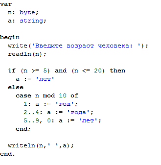 Дано натуральное число n(n<=100), определяющее в годах возраст человека. Составить программу, по которой на экран монитора выводится это число с наименованием «год», «года» или «лет».