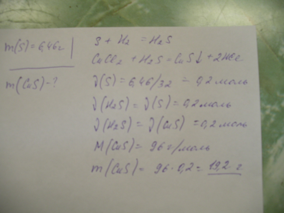 над нагретой серой массой 6,46г пропустили избыток водорода . образовавшийся газ пропустили черещ избыток водного раствора хлорида меди (2) . опредилите массу выпавшего осадка