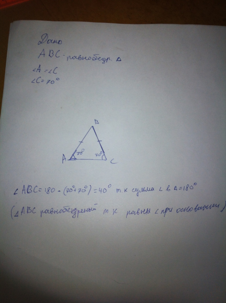 треугольник ABC равнобедренный ас-основание угол а= углу с=70 градусов д-точка пересечения биссектрис углов при основании