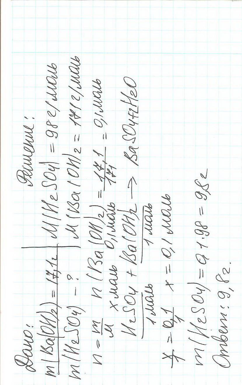 Из уравнения реакции следует, что количество вещества гидроксида бария равно количеству вещества серной кислоты, то есть v(Ba(OH)2) = v(H2SO4) = 0,1 моль