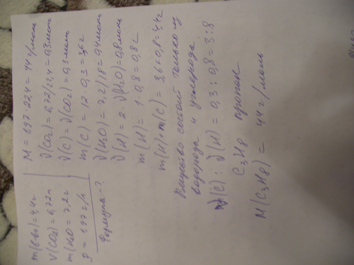 При сжигании 4,4 г органического вещества получено 6,72 л оксида углерода 4 и 7,2 г воды. Плотность при н.у. равна 1,97 г/л. Выведите молекулярную фолмулу
