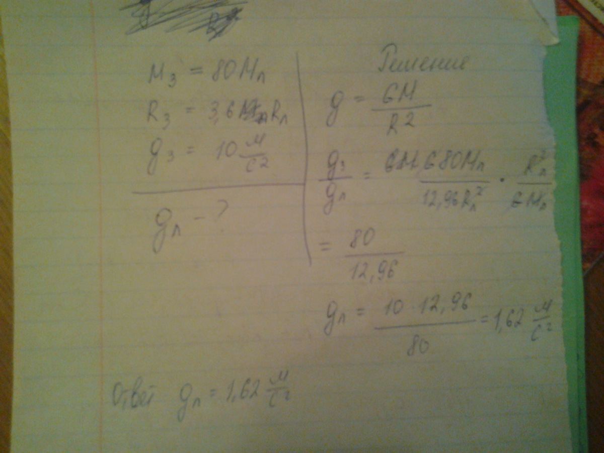 и из отношения g Земли/g Луны=80/12,96 выражаем g Луны.