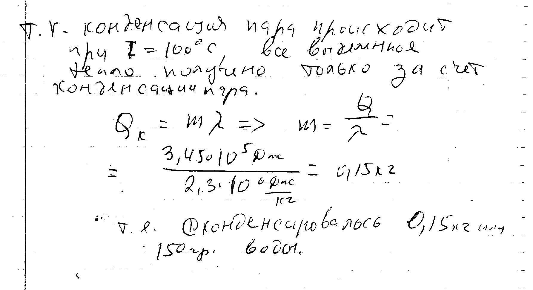 Какова масса воды, образовавшейся при конденсации пара, находящегося при температуре 100 градусов по Цельсию, если при этом было отдано 345 кДж теплоты? Удельная теплота парообразования воды равно 2,3 на 10 в 6 степени Дж/кг.