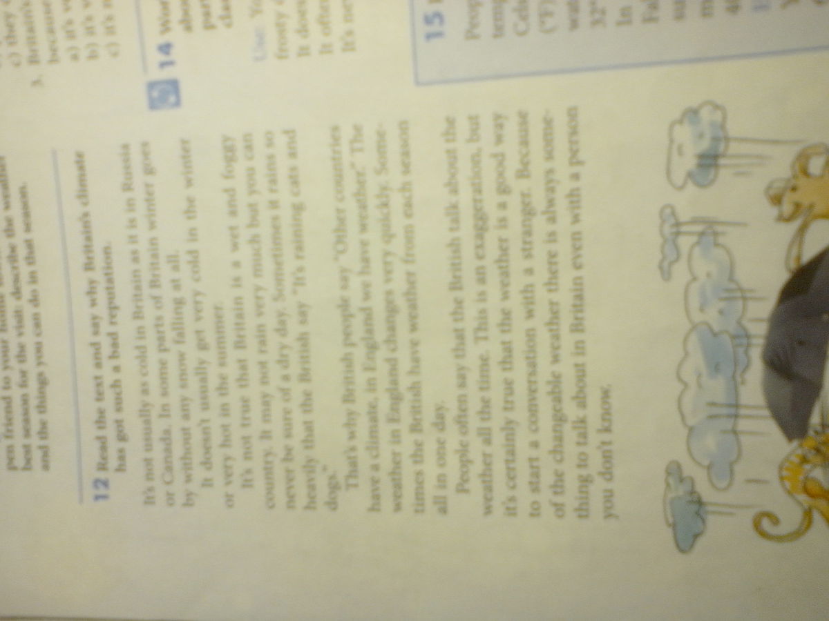 Люди обычно считают,что британцы всё время говорят о погоде.Хотя это преувеличение ,бесспорно,разговор о погоде является хороших началом беседы с незнакомцем.Из-за того ,что погода такая изменчивая,в Британии всегда найдется о чем поговорить с человеком,которого ты не знааешь.