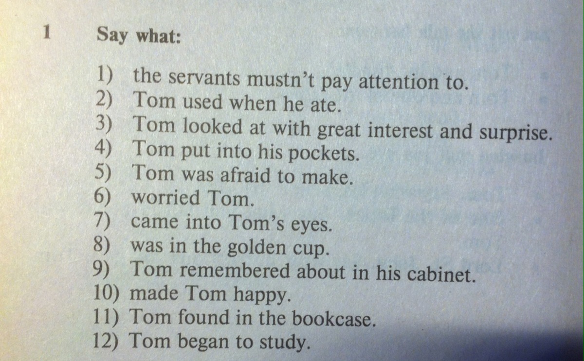 1 Скажите, что: 1) служащие не должны обратить внимание. 2) Том использовал, когда он ел. 3) Том посмотрел на с большим интересом и удивлением. 4) Том положил в карманы. 5) Том боялся сделать. 6) обеспокоены Том. 7) пришел в глаза Тома. 8) был в золотой кубок. 9) Том вспомнил о в своем кабинете. 10) сделал Том счастлив. 11) Том нашел в книжном шкафу. 12) Том начал учиться.