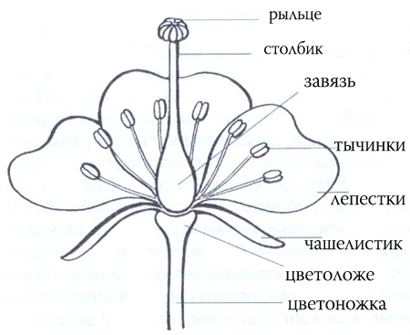 1)стеблевая часть (цветоножка и цветоложе) ;