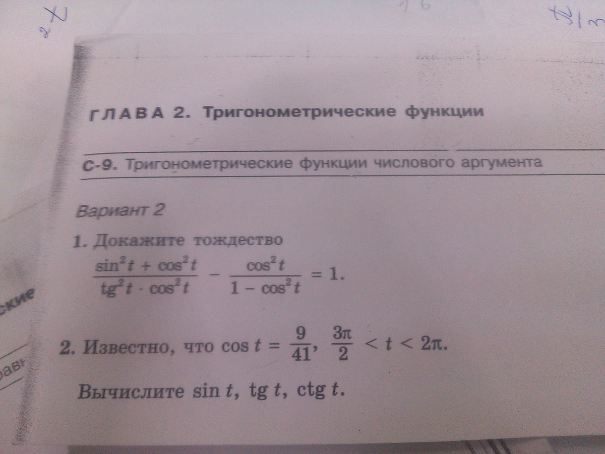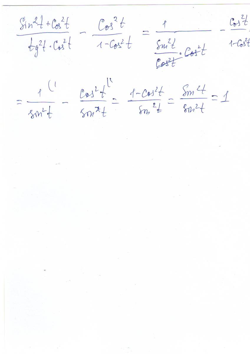 1) В числителе первой дроби стоит 1(основное тригонометрическое тождество). В знаменателе первой дроби заменим tg ^2 t как Sin^2 t/Cos^2 t. Сos^2 t cократится, останется Sin^2 t. В знаменателе второй дроби стоит