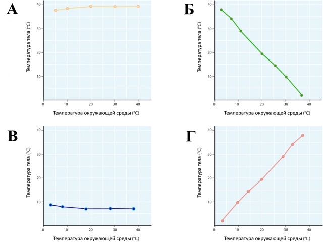 На графиках приведена зависимость температуры тела животного от температуры окружающей среды. Определите, какой из графиков отражает зависимость, характерную для пресмыкающихся, например, для ящерицы.