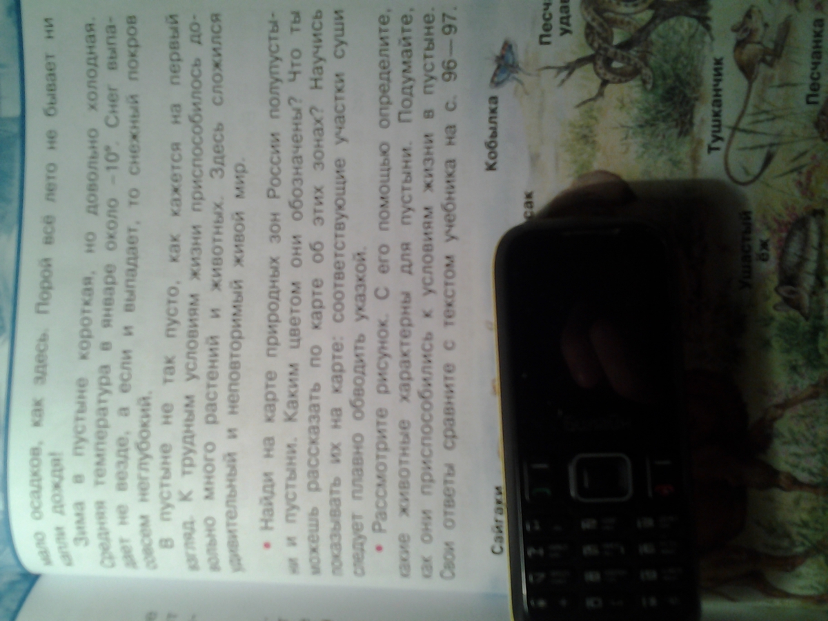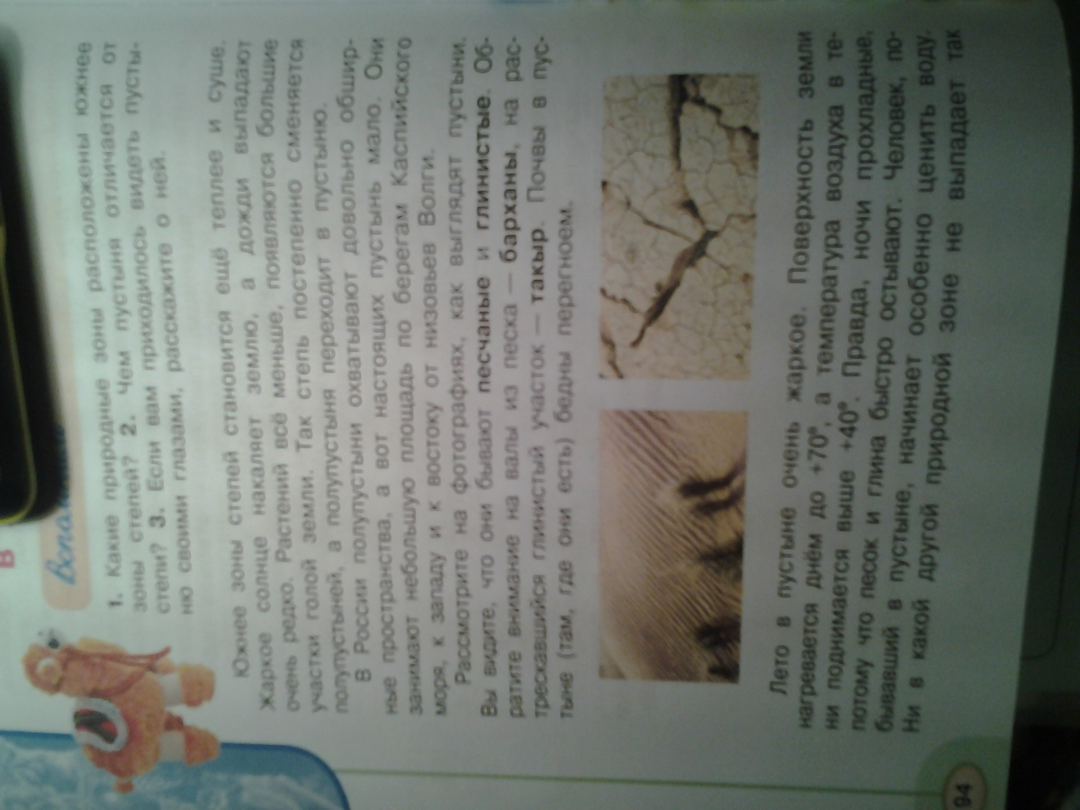 В пустыне очень жарко. Это суша. там очень мало воды. Дожди выпадают очень, очень редко! Пустыня занимает небольшую площадь по берегам Каспийского моря. Пустыни бывают песчаные и глинистые.Поверхность земли нагревается днём до 70 градусов. Ночью прохладно так как песок и глина быстро остывают. Там выпадает очень мало осадков. Там есть растения: верблюжья колючка, колосняк, джузгун. Там есть животные: верблюд, саджа, сайгаки, песчанка, ушастый ёж, тушканчик, корсак.