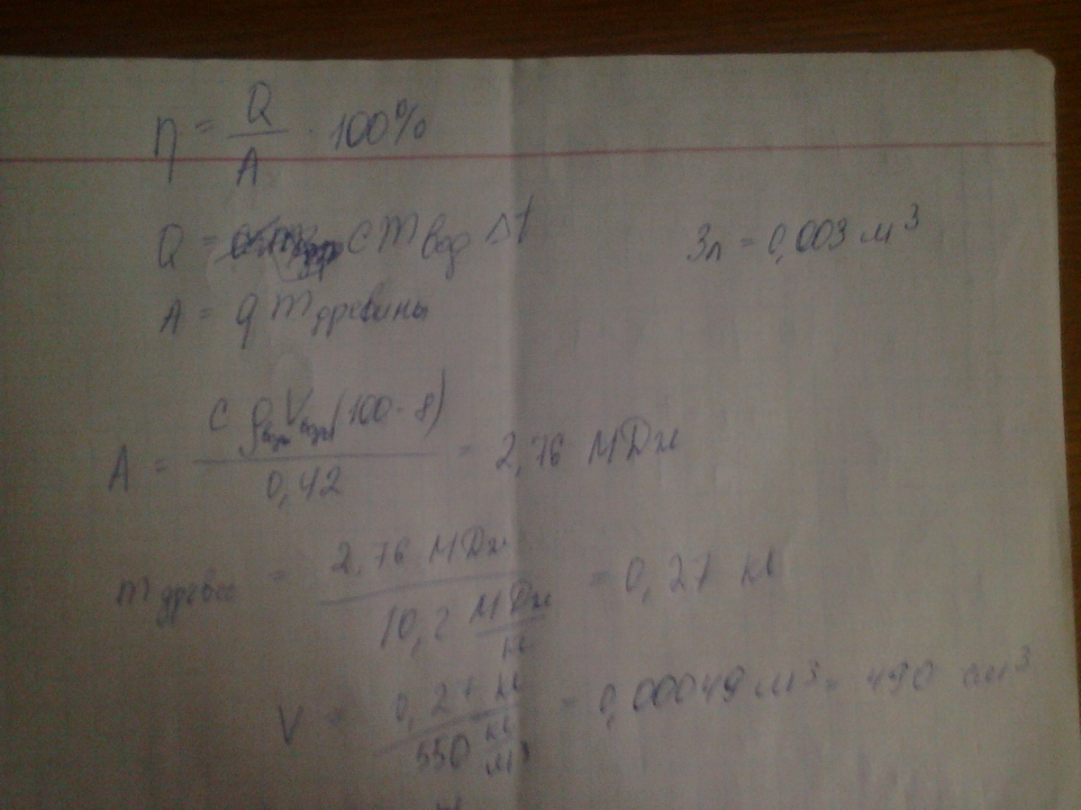 Сколько м3 сухих дров необходимо сжечь в печке с КПД 42% чтобы вскипятить 3литра воды взятой при 8 градусах