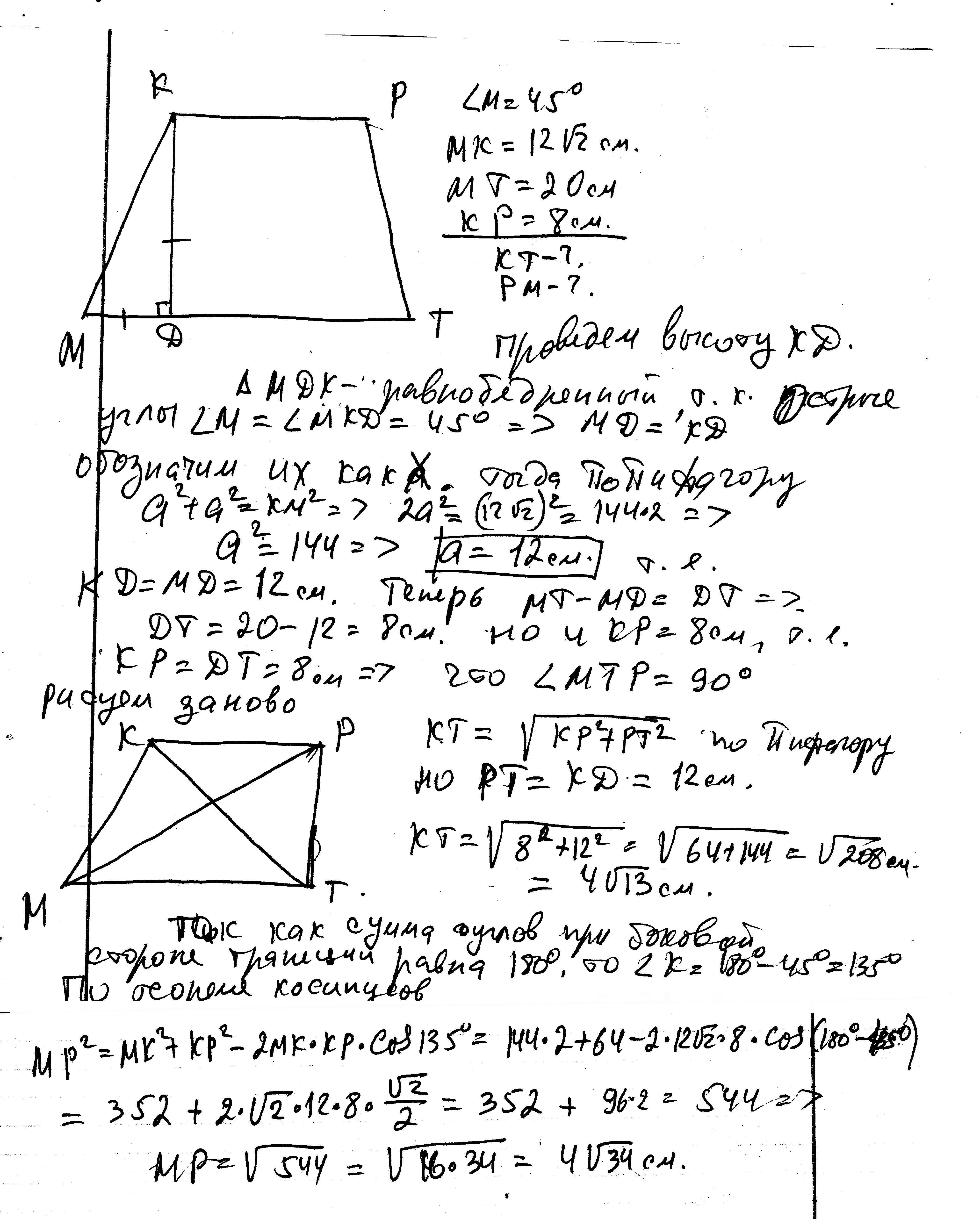 МК равен 12 корней из 2(см) , МТ =20см, КР= 8 см.