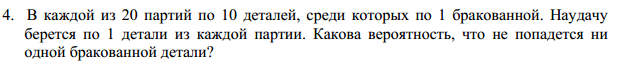 В каждой из 20 партий по 10 деталей, среди которых по 1 бракованной. Наудачу