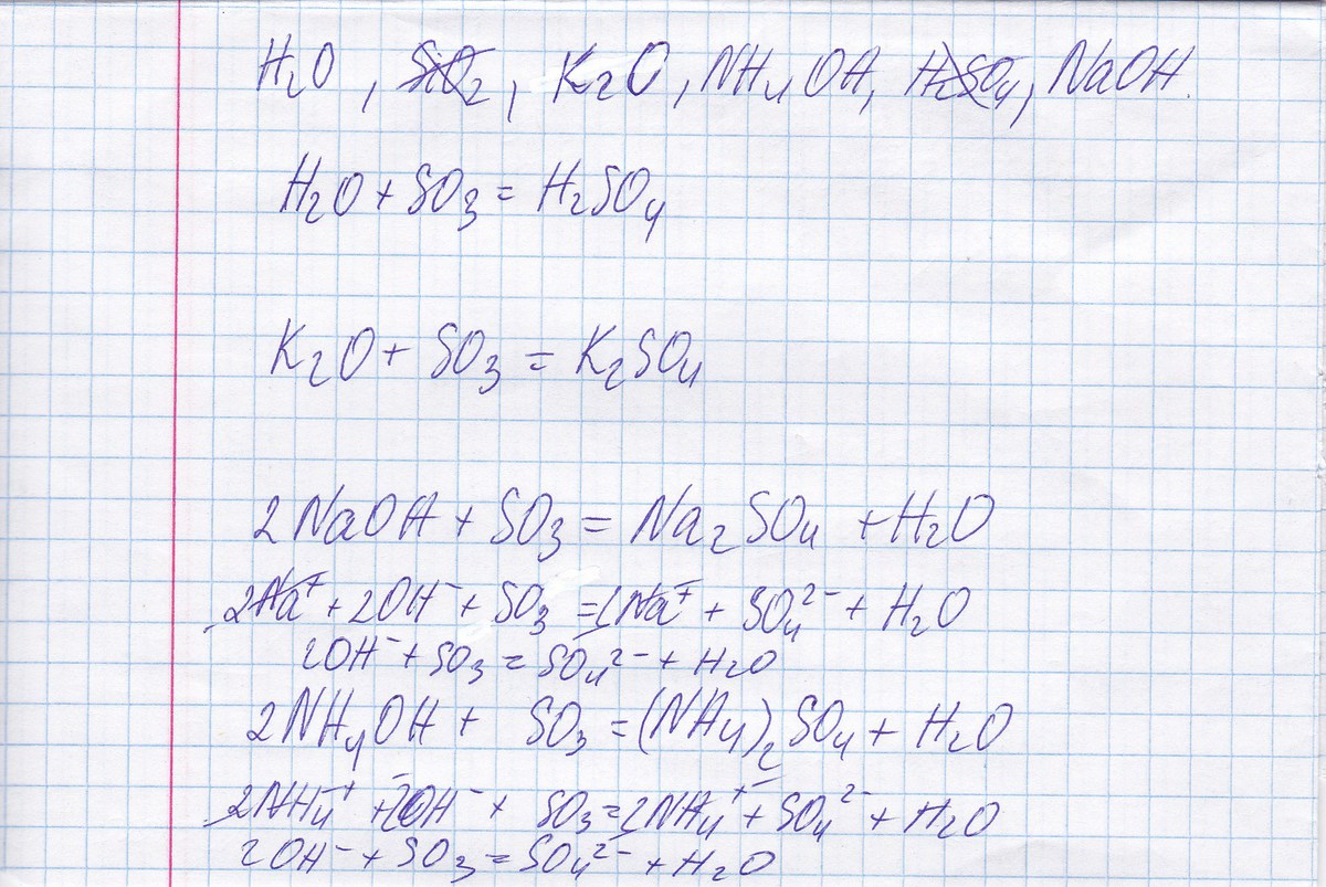 с какими из следующих веществ: вода, оксид кремния (4), оксид калия, гидроксид аммония, серная кислота, гидроксид натрия будет взаимодействовать оксид серы (6)? составьте уравнения реакций, напишите в ионном полном и сокращенном виде