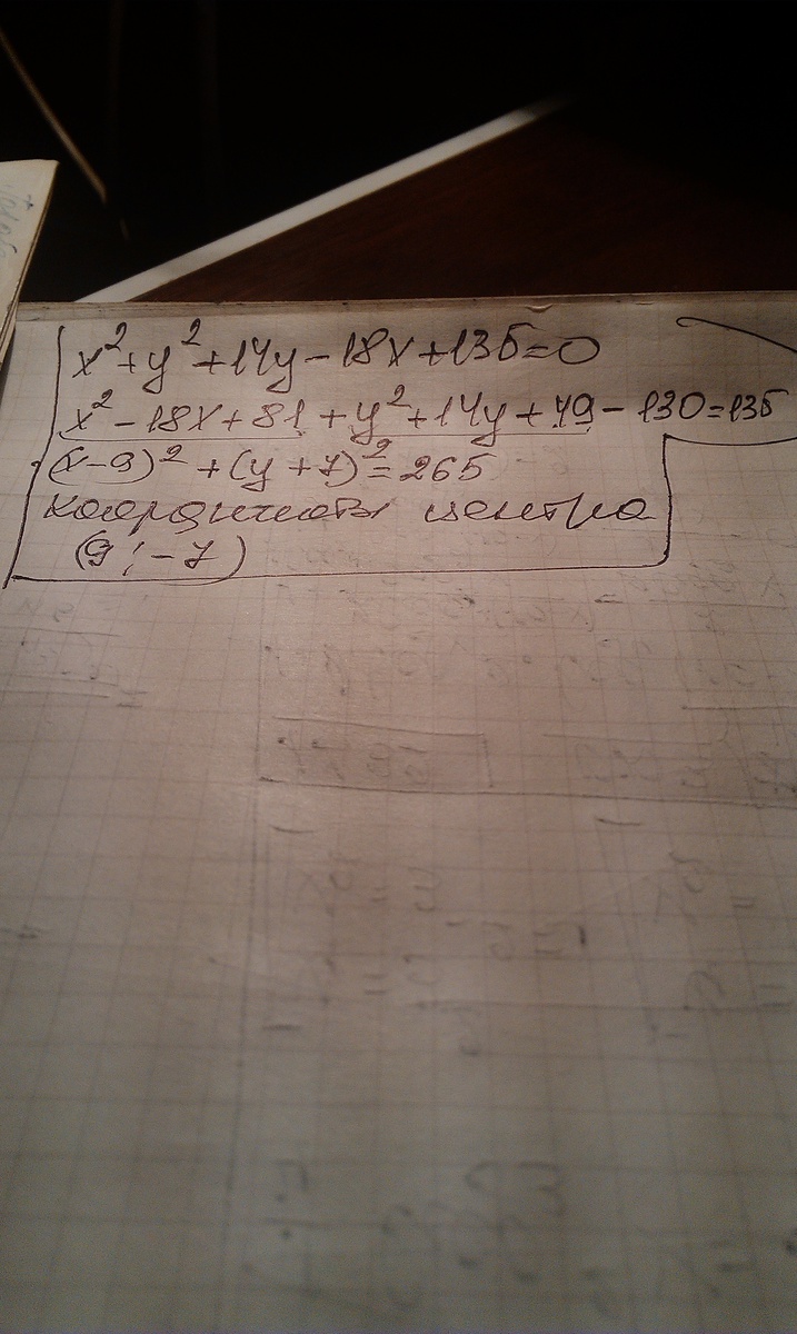 Найдите координаты центра окружности x^2 + y^2 + 14y - 18x + 135 = 0.