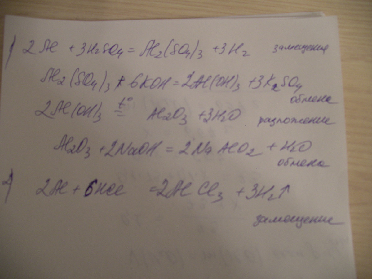 помогите с химией прошу!!!!! 1)Al-> Al2(SO4)3-> Al(OH)3-> Al2O3-> NaAlO2 2) Al->AlCl ( напишите названия реакций )