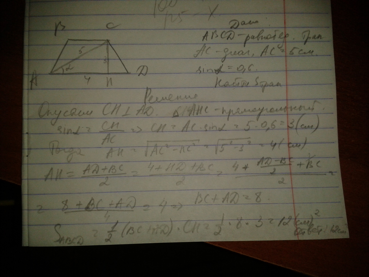 найдите площадь равнобедренной трапеции если ее диагональ равная 5 образует с основанием угол синус которого равен 0,6