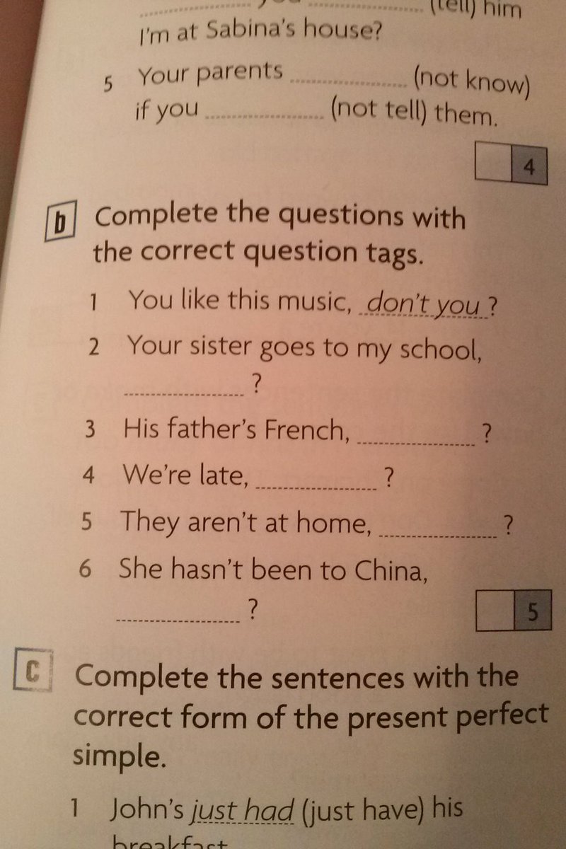 2)doesn't she? 3)Doesn't he? 4)Aren't we? 5) aren't they? 6)Hasn't she?