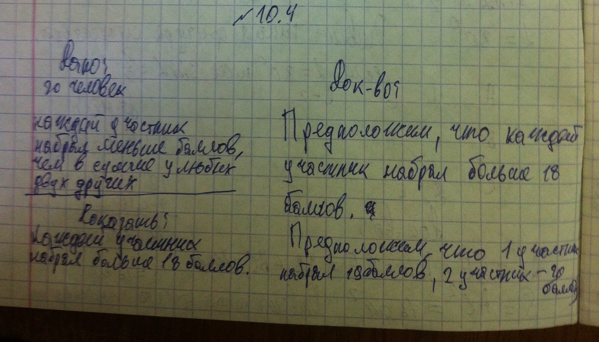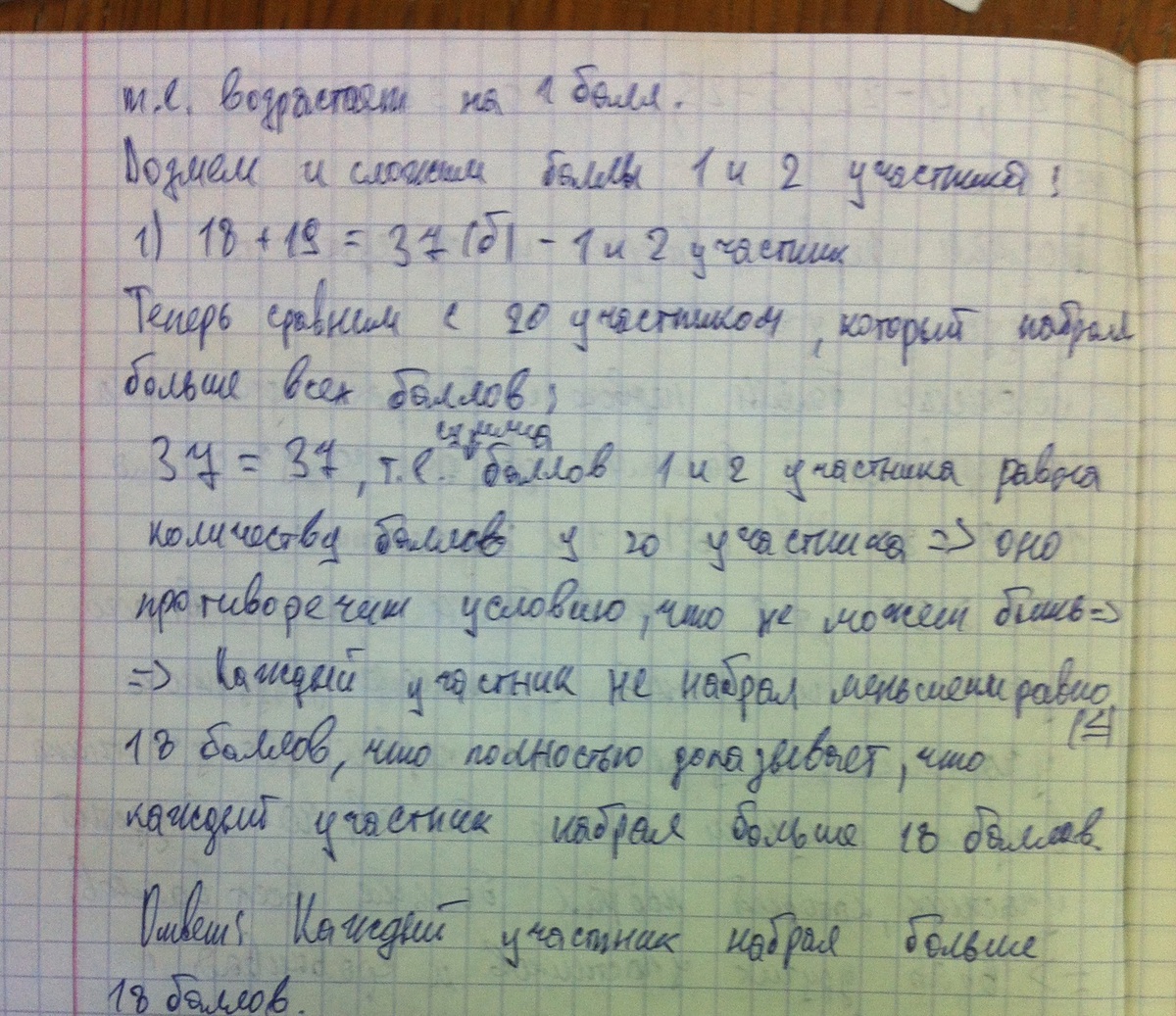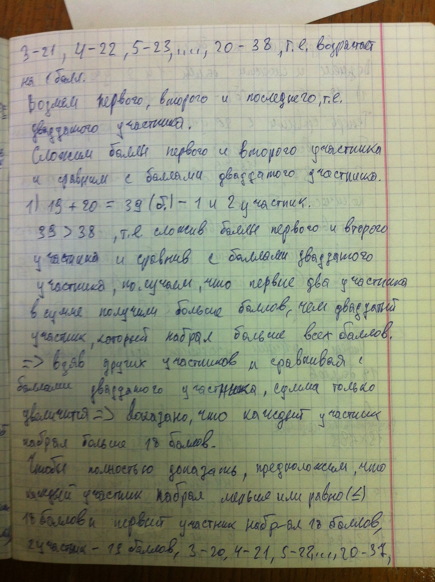 В школьной математической олимпиаде 9-х классов участвовало 20 человек. В результате все участники набрали разное количество баллов, причем у каждого участника количество баллов меньше, чем в сумме у любых двух других. Докажите, что каждый участник набрал больше 18 баллов. Помогите плиз срочно надо!!!