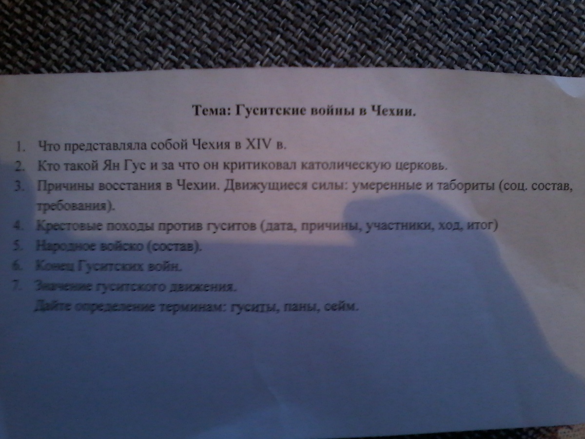 2. Ян Гус — чешский мыслитель и проповедник. Осуждал накопление богатств духовенством и церковью, призывая вернуться к "евангельской бедности"; считал, что для того, чтобы каждый человек мог понять "Закон Божий", богослужение должно проводиться чешским языком; критиковал католическое причастие для духовенства хлебом и вином, а для граждан только хлебом, доказывал, что в христианстве все причащались одинаково.
