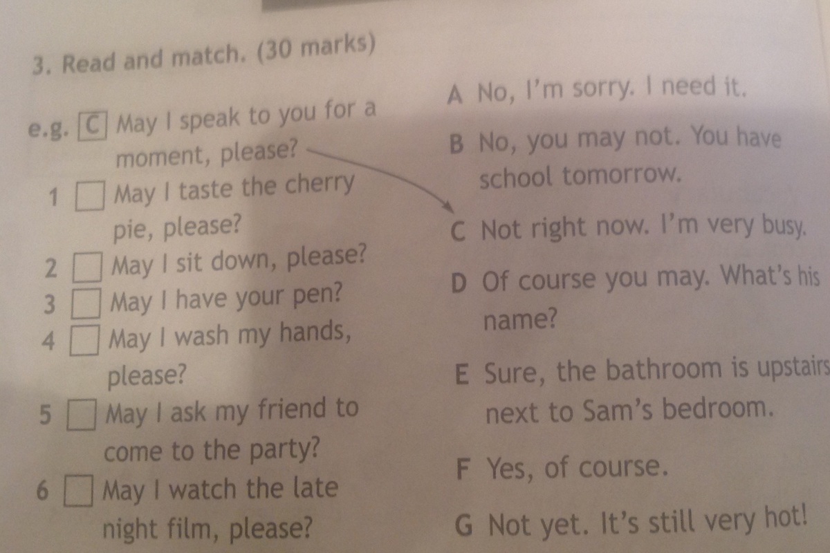 СРОЧНО!!Помогите сделать английский язык. Нужно ответить на вопросы. Даю 32 балла 1)May i taste the cherry pie , please 2)may i sit down, please 3)may i have your pen 4)may i wash my hands, please 5)may i ask my friend to come to the party 6)may i watch the late night film , please Ответы: A) no I'm sorry I need it B)no you may not you have school tomorrow D)of course you May what's his name E)sure hte bathroom is upstairs next to Sam's bedroom F) yes of course G)not yet it's still very hot