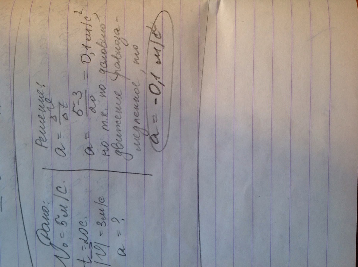 Конькобежец, разогнавшись до скорости v0 = 5 м/с, начал скользить прямолинейно и равнозамедленно. Спустя время t = 20 с модуль скорости конькобежца стал равен v = 3 м/с. Чему равно ускорение конькобежца?