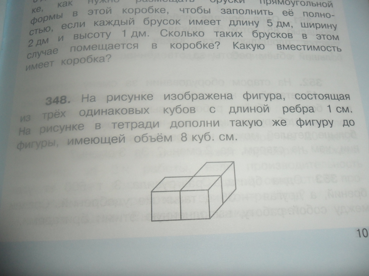 На рисунке изображёна фигура состоящия из трёх одинаковых кубов с длиной ребра 1 см. На рисулке в тетради дополни такую же фигуры до фигуры,имеющей объём