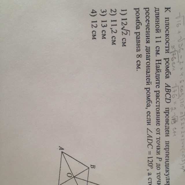 К плоскости ромба abcd проведен перпендикуляр CP длинной 11см.Найдите расстояние от точки Р до точки пересечения диагоналей ромба,если угол ADC=120,а сторона ромба равна 8 см.