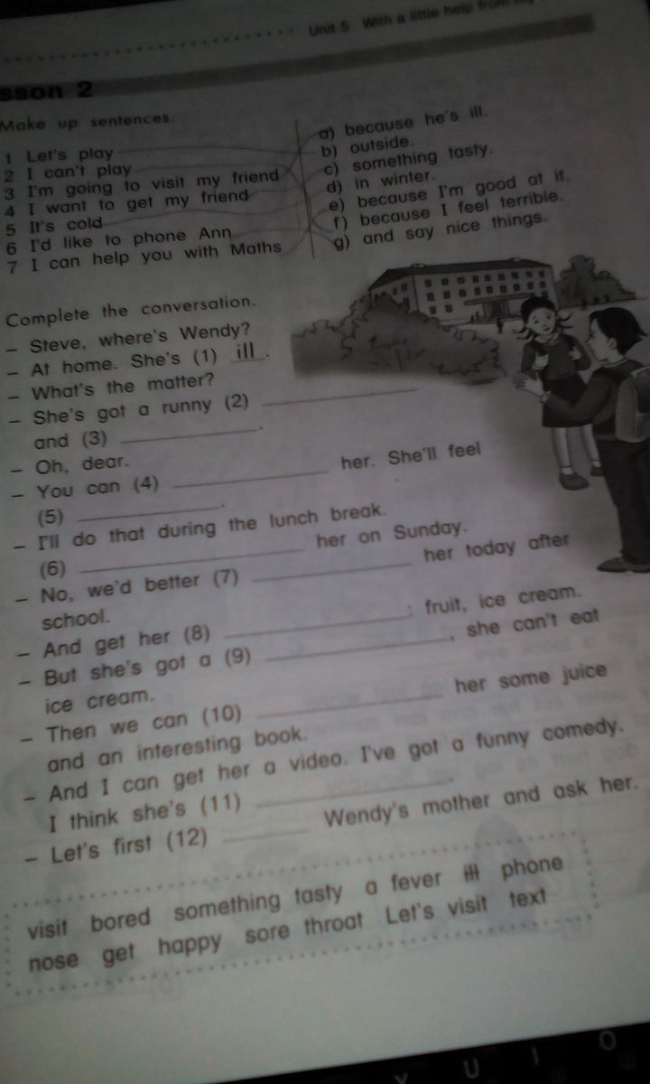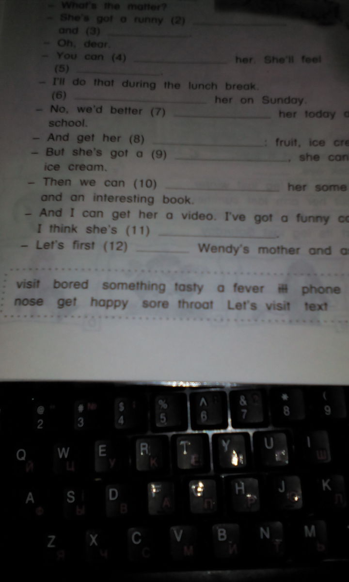 2. Nose; 3. Sore throat; 4. Text; 5. Happy; 6. Let's visit; 7. Visit; 8. Something tasty; 9. Fever; 10. Get; 11. Bored; 12. Phone