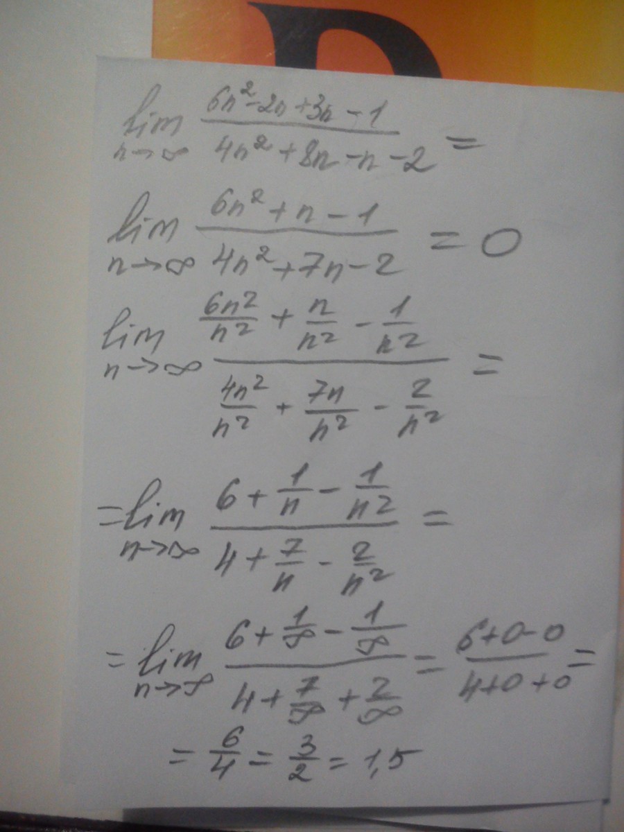 ответ 6/4 ;нужно раскрыть скобки, привести подобные слагаемые, затем числитель и знаменатель разделить на n^2. Число деленное на бесконечность это ноль