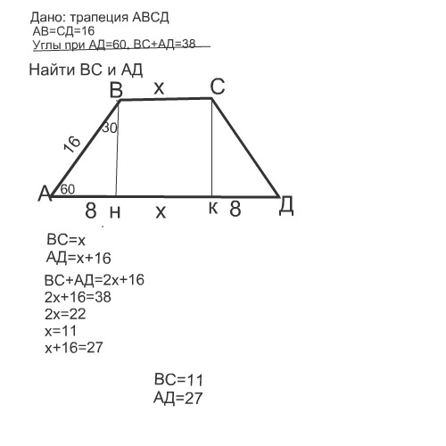 АД+ВС=16+х+х=38см