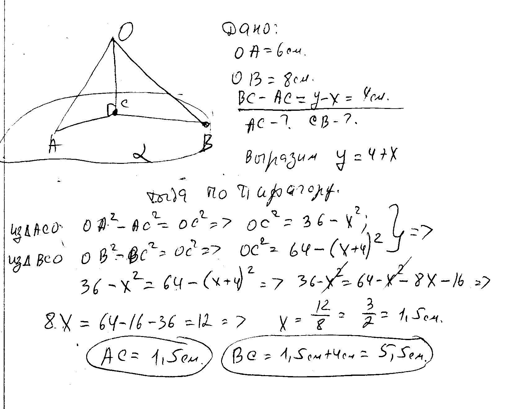 OC перпендикулярно плоскости альфа, Наклонные OA=6см OB=8см. При этом разность проекций на плоскость bc-ac=y-x=4см