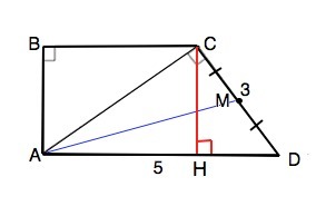В трапеции ABCD угол A равен 90, градусов, боковая сторона CD перпендикулярна диагонали AC; CD равен 3 см, AD равен 5 см, 1) Найти площадь трапеции. 2) Найти площадь треугольника AMD, если M – середина CD.