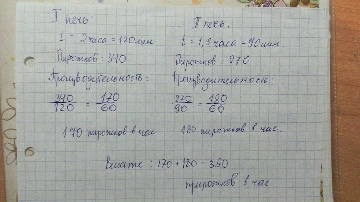 2. Первая печь за 2 часа выпускает 340 пирожков , а вторая печь за один час 30 минут выпускает 270 пирожков ? Определить производительность за один час ?