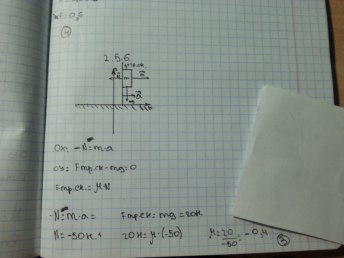 Если вертикальную подвижную стенку перемещать горизонтально с ускорением >=25 м/с^2 , то приложенный к ней брусок массой 2 кг не соскользнет .Каков коэфициент трения бруска о стену?