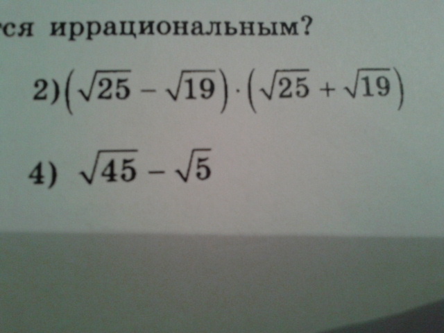 в первом я воспользовалась формуле сокращенного умножения а (квадрат) - в (квадрат). Во втором 45 разложила на 9 и 5, девять вынесла из под корня и получилось 3 кроинь с 5. тогда 3 кроинь из 5 - 1 кроинь из 5 = 2 кроинь из 5