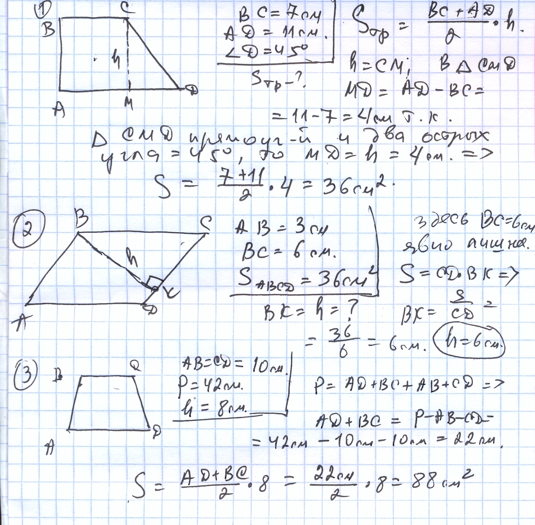 3)В равнообедренной трапеции авсд периметр равен 42 см боковая сторона равна 10 см найдите площадь трапеции если ее высота равна 8 см.
