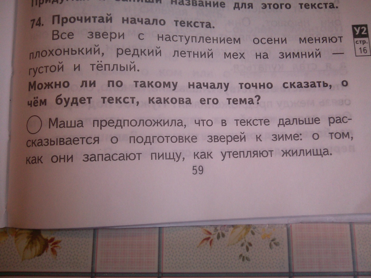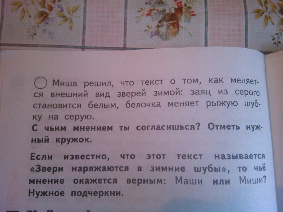 Я соглашусь с мнением Миши. В начале текста речь идёт конкретно о мехе животных и его цвету. Хотя Маша и права в том, что этот текст может быть про подготовку зверей к зиме, но всё же в начале текста ни слова не сказано об этом. Если же текст называется "Звери наряжаются в зимние шубы", то тогда я опять-таки соглашусь с мнением Миши, поскольку заглавие текста совпадает с темой текста, которую Миша предложил.