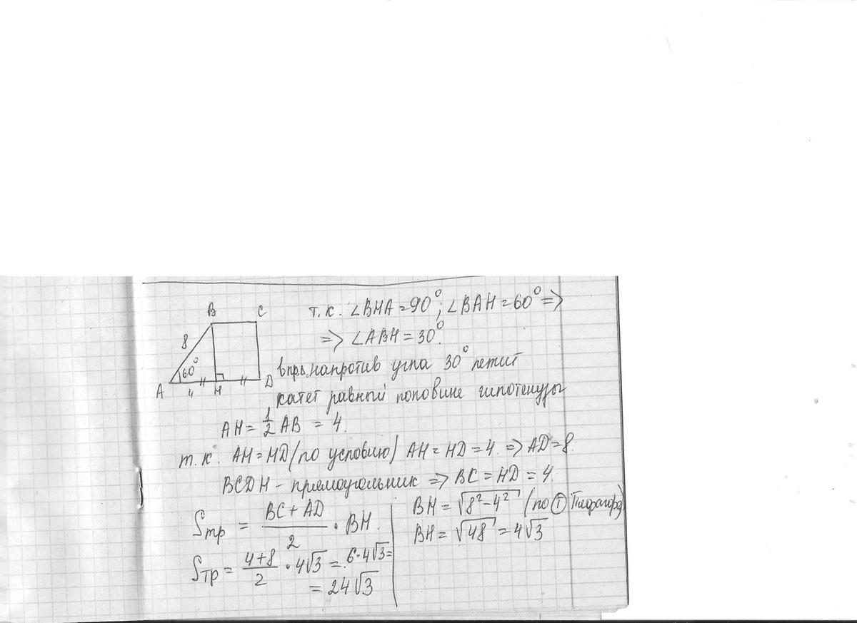 В прямоугольной трапеции АВСК большая боковая сторона равна 8 см, угол А равен 60градусов , а высота ВН делит основание АК пополам . Найдите площадь трапеции.